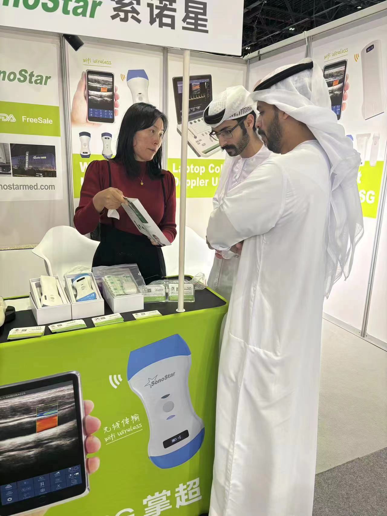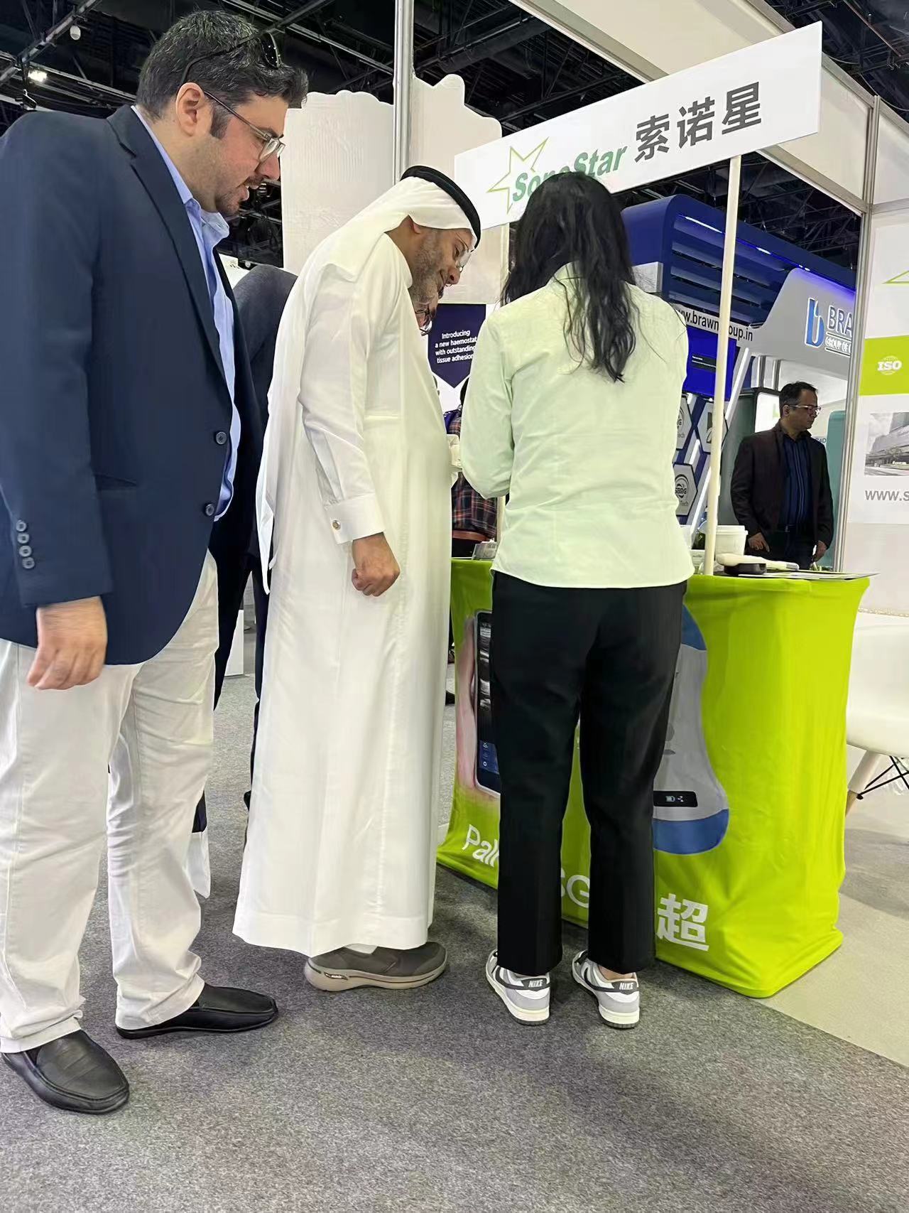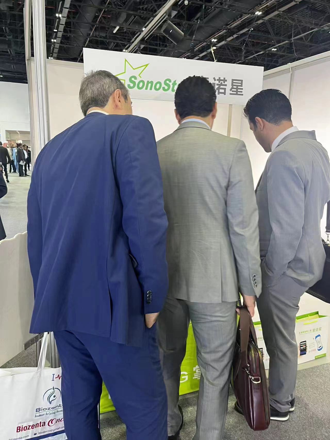 索诺星SonoStar成功参展2024年阿拉伯医疗展,这次展位位置比较好,加上我们的展台比较醒目产品比较吸引人,展会期间一直挤满了人,很多客户排队问产品,把旁边展位的人惊呆了来问我们为什么能这么吸引客户,以及展品也全部现场被买光了