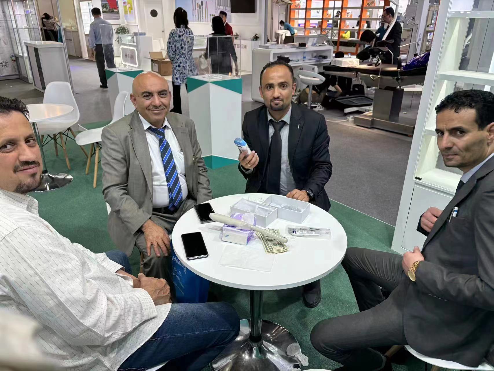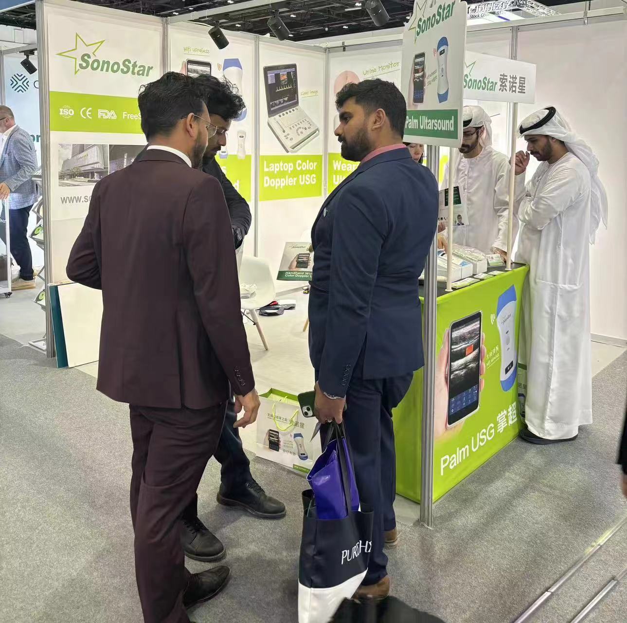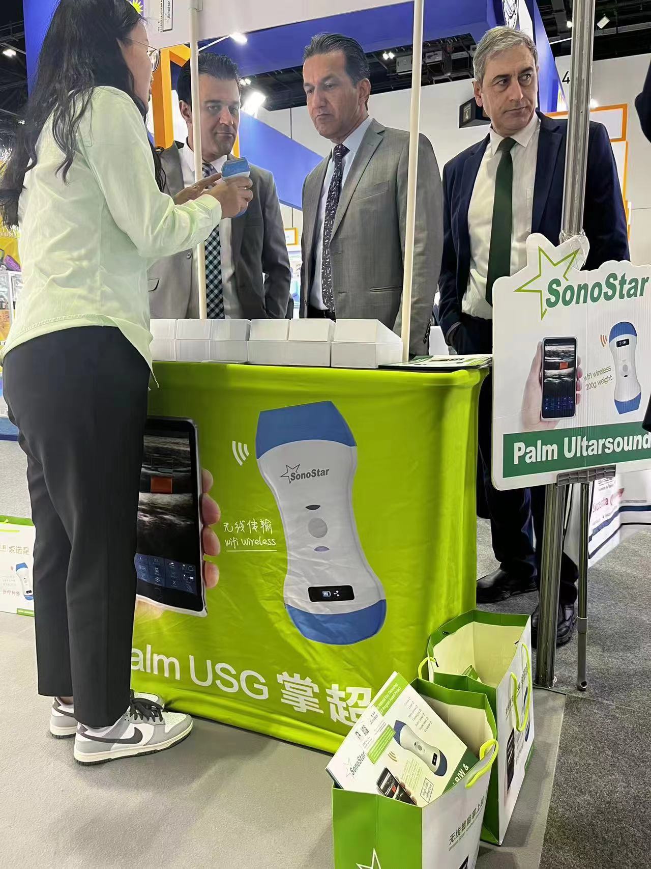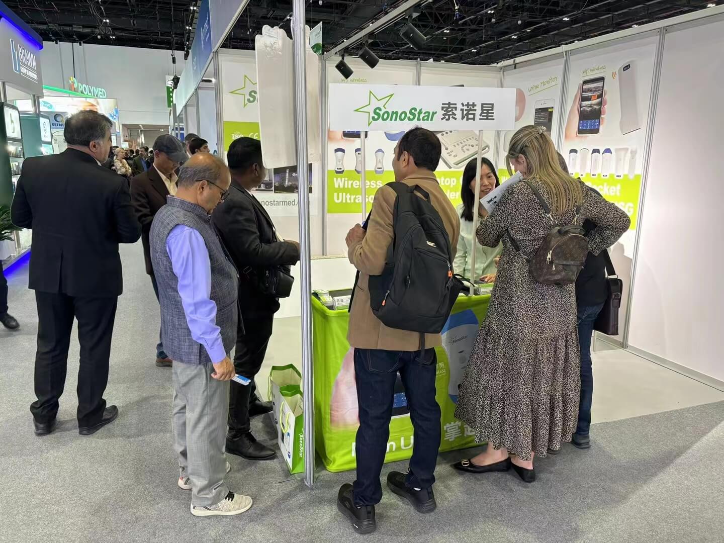 索诺星SonoStar成功参展2024年阿拉伯医疗展,这次展位位置比较好,加上我们的展台比较醒目产品比较吸引人,展会期间一直挤满了人,很多客户排队问产品,把旁边展位的人惊呆了来问我们为什么能这么吸引客户,以及展品也全部现场被买光了